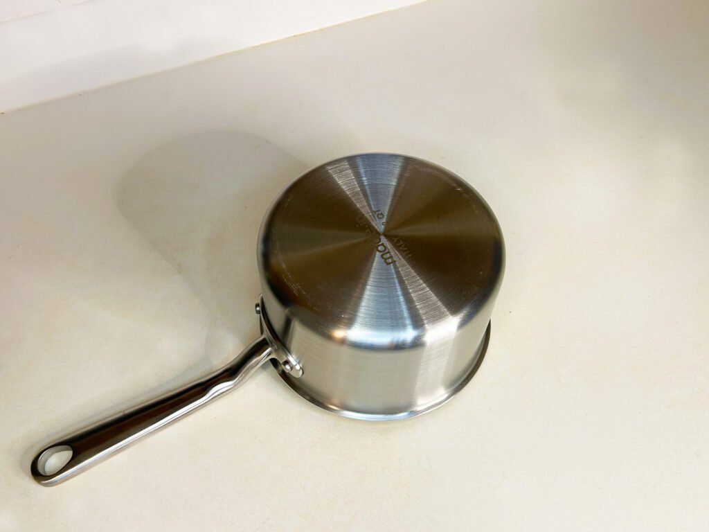 The first thing I noticed about the Made-in saucepan is its sleek design and simple, Italian-made quality. Constructed from premium stainless steel, it not only looks great but feels robust and, well …. serious. Its ergonomic handle offers a comfortable grip, making it easy to pour without any spills.