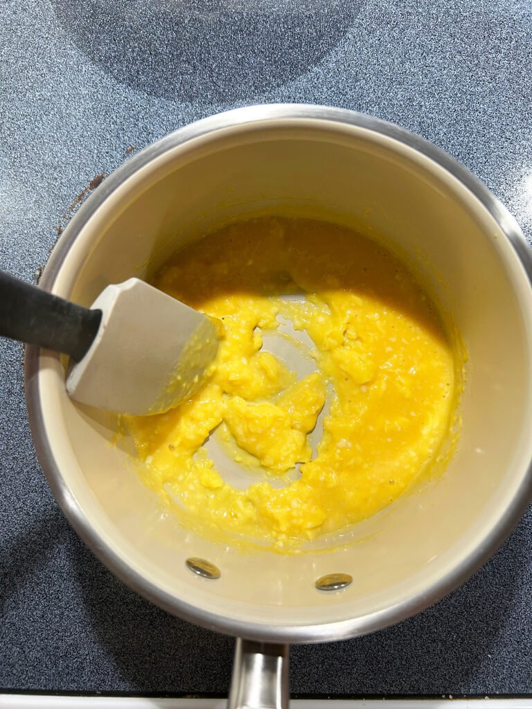 I have all kinds of cookware by Calphalon, Emerial Lagasse, Cuisinart, and many others with the names worn off, which means that especially with the non-stick ones, with age they aren’t as easy to clean. Using the MPW/Ramsay method can be messy and a hassle to clean. Basically, the main idea with this method is not to overcook the eggs and get a softer, creamier texture.